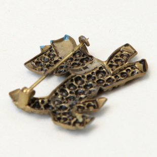 こちらは20年代のとても古い金属製のいぬさんのブローチです。デフォルメされたいぬさんが振り向き「ワン!」と言っているような可愛らしいブローチ。表面には耳や首輪の水色と、ぽちぽちの模様に白色の塗装が施されています。目の部分は塗装されておらず金色のままですが、一部塗装が剥げている部分がございます。90年ほども古く、ノスタルジックな雰囲気。古いものならではの存在感がありますので、シックなおしゃれにもおすすめ。