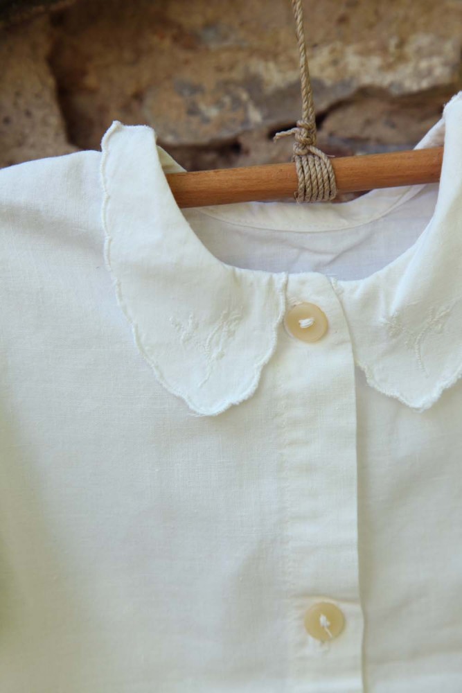 こちらはチェコの蚤の市で入手のベビー服のブラウス。生成りの綿で襟は波形に処理されシンプルな可愛い植物の刺繍が施されています。かなり古いもので戦中(1930年代)のものだそうです。保存状態も良く状態良好です。ボタンは前に3つ、アンティークならではの愛らしさ、繊細さが感じられます。汚れ、穴あきなどありません。身頃の割からして若干着丈の長い裁断です。長い年月を経て大事に保管されてきたとっておきのアンティーク・ベビー服をチェコからお届けです。