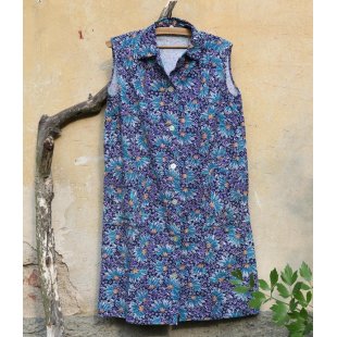 こちらはとっておき、チェコのおばあちゃんのかっぽう着です。どのくらい古いか正確には分かりませんがレトロな雰囲気たっぷりのエプロンです。こちらは青が基調になった涼しげなエプロン。青いお花の揺れている下地に丸い水玉の模様です。まだまだお使い頂けますが長く使用されていてくたびれた感じがあります。また全体的に軽い色あせが見られますが、レトロな商品として味をお楽しみ頂ければと思います。実際に使用するとこのタイプのかっぽう着(前でボタンで着るタイプ。)使い勝手がよく大変実用的な優れものです。前に大きなポケットもついています。大きさはざっくりと着る感じでLサイズです。『チェコのご家庭からシリーズ』のとっておき商品です。