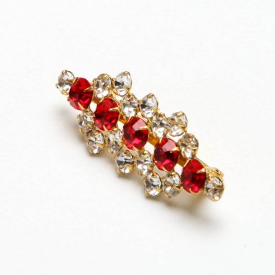 こちらはチェコのガラスの街ヤブロネッツのとっておきカットガラスのブローチ。こちらでも伝統的な高い技術でつくられたカットガラスのアクセサリーは定番になっています。透明と赤の21個のカットガラスが埋め込まれシンプルなデザイン。長さは4.2cmでワンポイントに程よい大きさ。角度によって輝きを変えるカットガラスならではの豪華な雰囲気を持ちます。ワンポイントに重宝しそうですので、さりげないおしゃれがお好きな方におすすめです。石のカケや傷などもなく状態も良好です。