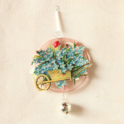 こちらはチェコのアンティークのクリスマス飾り。なんと1920年代の90年近く古いものです。紙にプリントされたレトロながらも鮮やかなイラストが美しい飾りで、ほのかなピンク色をしたリングの中に青いお花が溢れる手押し車が浮かんでいるようなノスタルジックなデザイン。紙の裏には銀色のキラキラした飾りをついています。とても繊細なものですが古いものならではの上品な存在感。今年のクリスマス、チェコのアンティークで特別な演出をお楽しみ頂けます。経年の風合いがありますが保存状態も良好です。