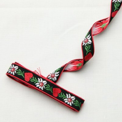 こちらはチェコのエーデルワイスとハートのチロリアンテープ。こちらではクラシックなお柄ですが、もう手芸屋さんでもほとんど見られなくなったタイプのお柄です。黒地に白いエーデルワイス、真っ赤なハートの大胆で美しいデザイン。幅は1.4cmと割と細めでお洋服や小物の縁取りとして大変おすすめ。強い印象を添えてくれるチェコならではのテープです。