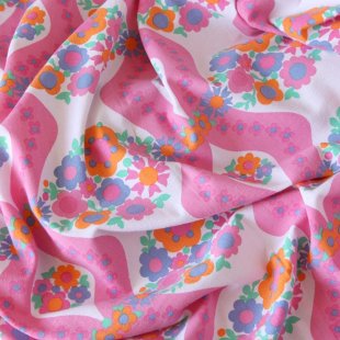 こちらはチェコの古いお布のはぎれです。大きさは126x 172cmとかなりたっぷりあります。厚手のしっかりした綿100%。洗いざらした感じの質感と若干プリントが全体的に薄くなっている感じはあるりますが、もともとかなり厚手の布なので状態はまだまだ良好。大体60−70年代頃の物と思われます。最近このような典型的レトロ柄のはぎれがあまり入手が難しくなりつつあります。ショッキングピンクやオレンジなどの明るい色合いとにぎやかな雰囲気が素敵なお柄。お裁縫のアイディアが膨らみます。
