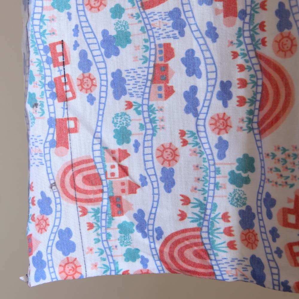 こちらはチェコのおばあさまのコレクションより譲って頂いたはぎれ。薄手のジャージーのような素材のお布です。若干経年の風合いがございます。汽車や野原、太陽などのにぎやかなプリントが可愛らしいはぎれです。数カ所布の端にペンのインクのような汚れのある箇所があります。