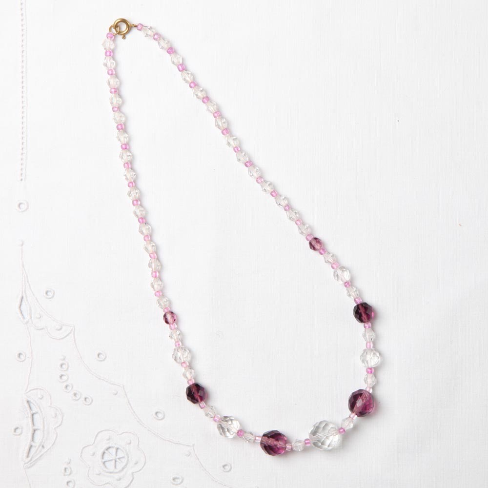 こちらはプラハのアンティークで入手の1920-30年年代に作られたガラスのネックレス。こちらは一つ一つて手作業にてカットの施されたクリスタルガラスの玉が連なったネックレス。お色はピンクと紫の組み合わせです。派手さをおさえた上品な感じです。デッドストックで長く眠っていたものを入手での販売ですが、こちらはよく見ると2、3点の極小さなカケが見られます。(写真でご確認下さい。カケは目立つほどではありません。)クラシックなデザインの素敵なネックレス。柔らかな光で角度によってキラキラと輝きを放つ素敵なネックレスです。また長い時間を経てきた美しさも感じられます。