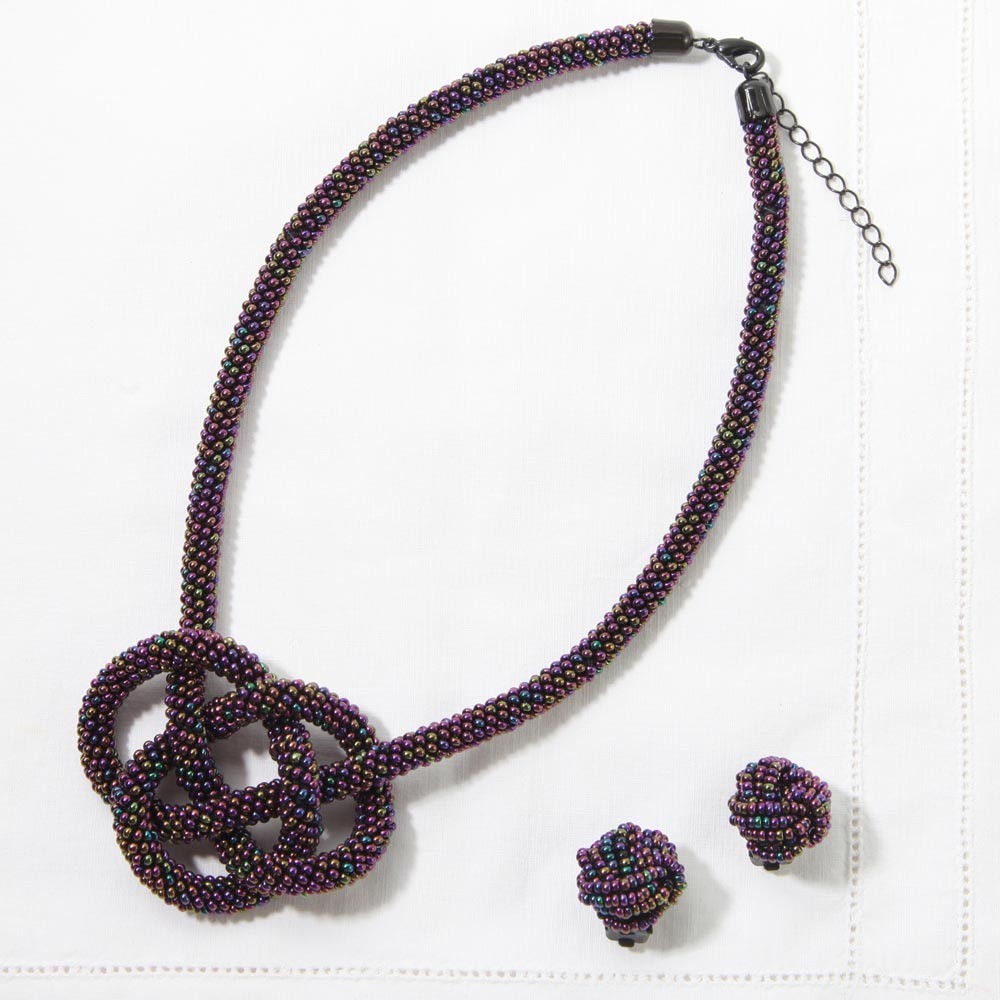 こちらはチェコでは長い間伝統的に作られている製法で制作されているビーズのちょっと太めのチョーカー。こちら国内でも人気のロングラン商品です。細かなビーズを連ねたラインを螺旋状に巻いて一本の綱のような構造になっているのが特徴。こちらのネックレスは中央にしめ飾りのような結び目が作られています。この製法のネックレスでは、よく使われる結び目です。こちらは一色のとてもシンプルなネックレスですが、個性と存在感があり、Tシャツなどでのシンプルなコーディネイトにとても良く合います。また若い人にも年配の方にもお使い頂けるユニバーサルなチョーカーです。お色は淡く虹色に発色する紫や緑色などの混じっていて全体的なお色な紫色です。渋くて上品。今回はお揃いのイヤリングと一緒に販売でお求め安価格になっております。ガラス工房で一つ一つ丁寧に制作されたとっておきのチェコ商品です。新品。