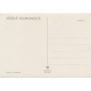 こちらはヘレナ・ズマトリーコヴァーのイラストのポストカード。イースターの象徴であるうさぎのイラストです。うさぎが色とりどりの卵(こちらもイースターの象徴。)でお手玉をしている愉快なかわいいカードです。表面に極小さな青いインクの汚れがあります。写真でご確認下さい。状態は悪いものではありません。こちらは未使用のカードです。