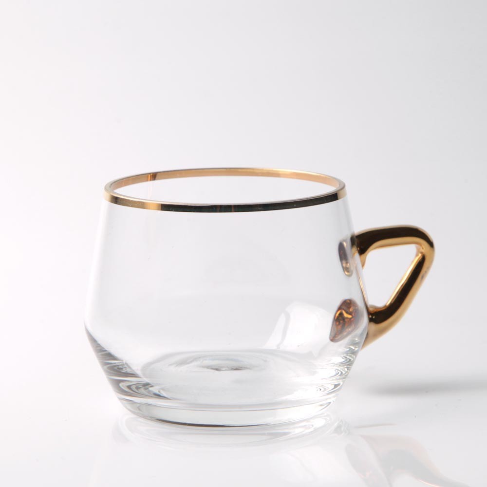 こちらはチェコスロヴァキアとドイツでかつて流通したガラスのコップ。把手の部分と飲み口に金のアクセントが入っていて繊細な雰囲気の美しい小さなコップです。小さな小物を入れてインテリアなどに使用するのもおすすめです。金の塗料の剥げが見られるこのタイプの商品ですが、こちらは剥げやカケもほとんどなく状態はいいものです。付随してたお皿(金属製)はなく、こちらのカップのみの販売となります。