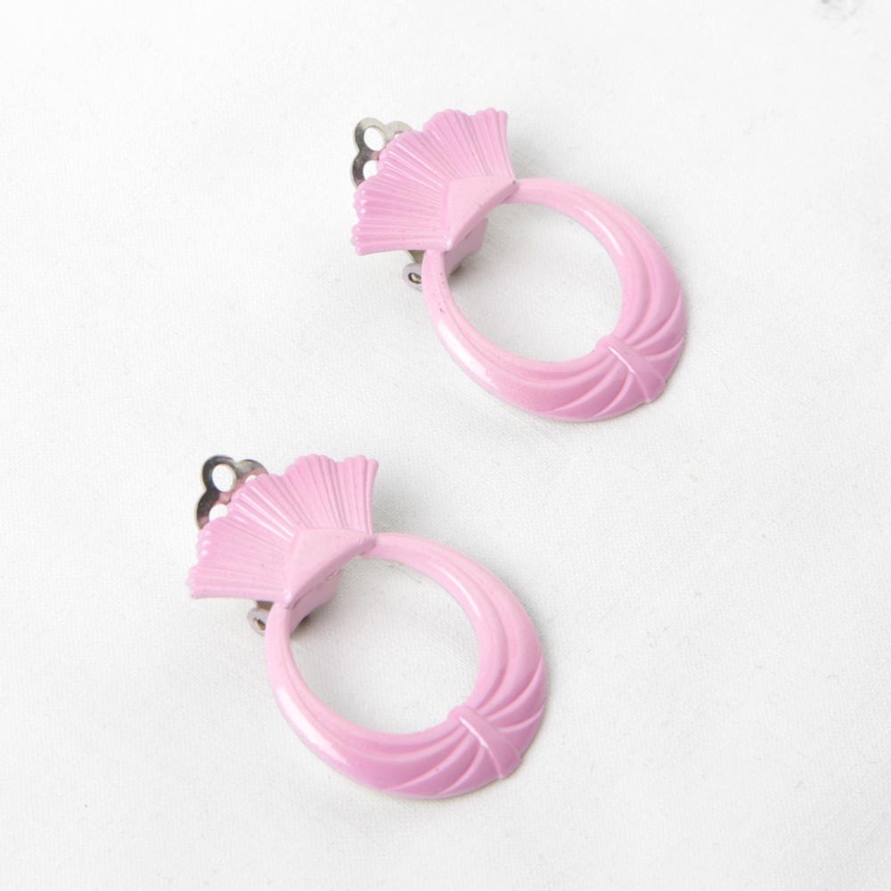 こちらはチェコスロヴァキア時代のヴィンテージイヤリング。丸い輪と扇を組み合わせた様な珍しいデザインです。金属プレートにピンクの塗料が吹き付けで塗られています。大体80年代頃のものと思われます。オリジナルなテイストの一点物です。