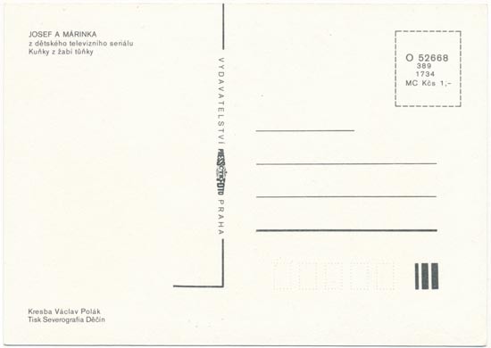 こちらはチェコスロヴァキア時代に流されていたヨゼフとマーリンカという子供番組のポストカードです。ちょっとマニアックなテレビシリーズだったようで、今となってはあまり詳しい情報はわかりません。イラストはヴァーツラフ・ポラークというイラストレーターが担当しています。こちらのポストカード、枠がテレビになってるのがレトロでキュートです。状態はよく1980年代のものです。