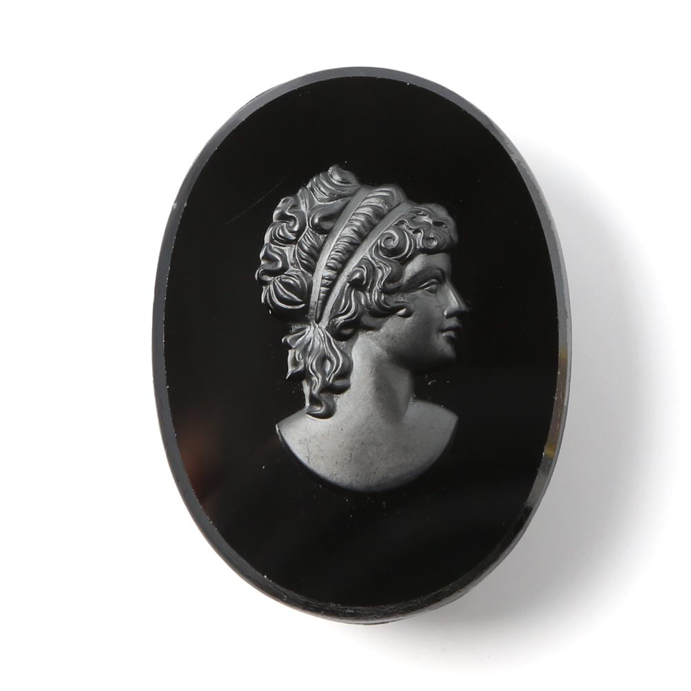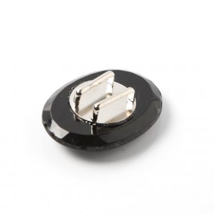 こちらはアンティークパーツのジェットガラス(黒ガラス)を使った帯留め。ジェットガラスは太陽の光も通さない漆黒のガラス。元々は木の化石を素材として作ったものをジェットと言いますが、チェコではそのジェットに類似したガラスがかつて作られていました。今では使えない薬を使用して作られたジェットガラスは黒の濃度がとても高く光にかざしても真っ黒です。こちらのパーツは年代は1930年代ごろまでの古いものです。中央にはチャコールグレーのガラスカメオが配置されていてノーブルな雰囲気があります。また表面は研磨されうっすらと金属塗料が施されていますので、鏡面のような輝きがあります。後ろには新しいパーツが付いていて、帯留めや、リボンを通せばチョーカーとしても使用できます。目立ったカケなどもなく状態は大変いいものです。(裏面にはガラスの研磨はされていませんのでカケのような凸凹があります。)パーツは残っているものだけ、とても貴重なガラスです。