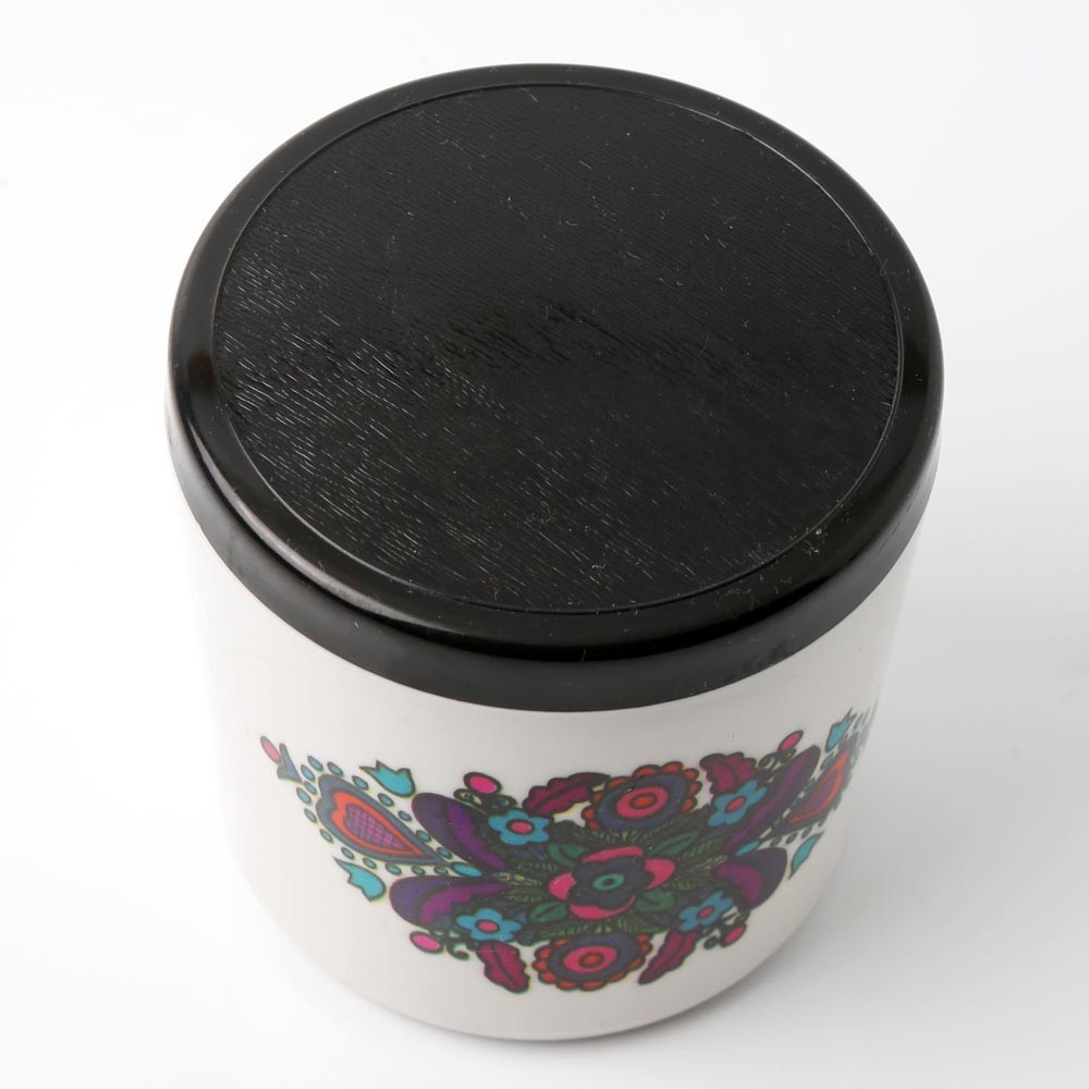 こちらはチェコのアンティークバザールで見つけたプラスティック製のキャニスター(保存用容器)。白くて丸い筒状のものに、黒い蓋が付いてます。表面はピンクや紫、緑のお色でお花やハートのモチーフのプリントされたシールが貼ってあります。ハンガリーやバルカン地方の刺繍を思わせるヴィヴィッドなプリントが素敵です。新品ではありませんが保存状態はとてもいいもので目立った汚れなどありません。70-80年代ごろのものと思います。砂糖袋を入れたり、飴を入れたり、またお裁縫箱のお供など、アイディア次第でお楽しみください。
