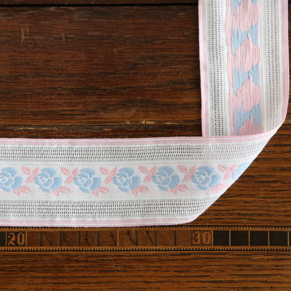 こちらはチェコの手芸屋さんのデッドストックのチロリアンテープのリボンです。白地の透けるレース地の真ん中にラインが入り、水色のバラとピンクの葉っぱのお花柄。葉っぱのグリーンと、レース地と両端のピンクのラインが優雅なリボンです。柔らかな雰囲気のガーリー感満点のリボンです。幅も4.7cmと広めで小物などに使うと、美しく映えると思います。チェコで唯一残るリボン工場でもコットン製のリボンが製造中止になりましたので、コットン100%の貴重なデッドストック。ずばり売り切り商品です。(再入荷の予定はございません。)
