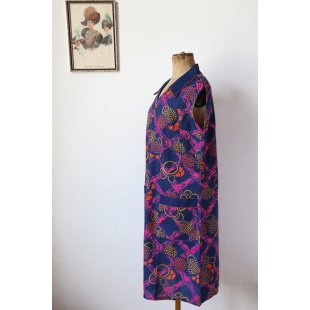 チェコだけでなく、隣国ドイツも素敵なレトロ柄のお布や洋服がたくさんあります。そんななかからこちらはレトロなデッドストックのエプロンドレスのご紹介です。紺の地にひまわりの様なお花と紫のラインの入った大胆な雰囲気のベストタイプのエプロンです。こちらは前はチャック式、左右には定番の大きなポケット。衿も大きめで際にはお柄と同じ発色のいいオレンジ色のパイピングのアクセント。この現代にはないセンスが魅力です。未使用品ですので新品のように状態はいいものです。タグには純粋な綿とドイツ語で表記がありますので、綿100%だと思います。洗濯の時に色落ちする可能性がございますのでご注意下さい。日本のLサイズです。