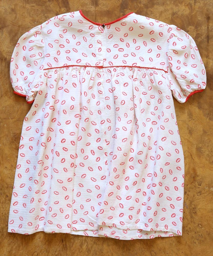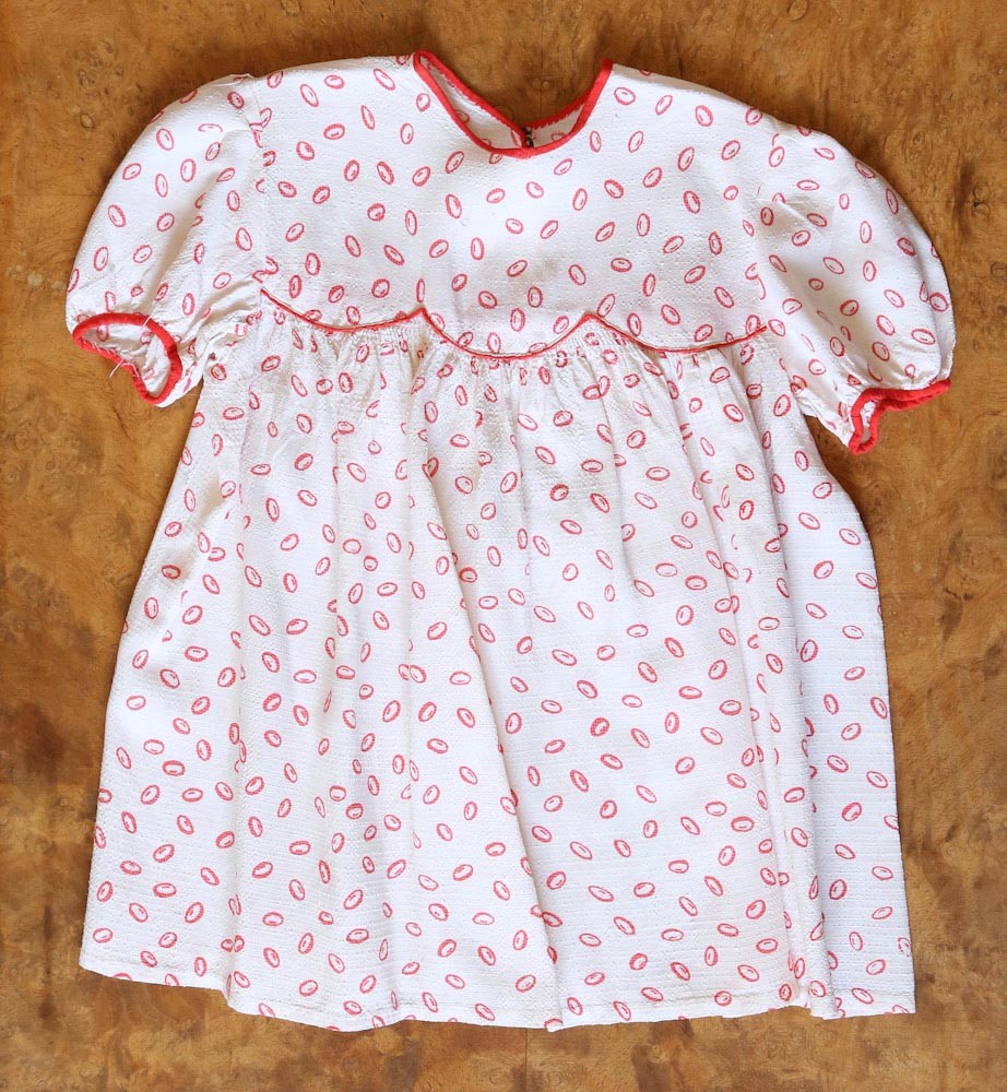 こちらはチェコのご家庭から入手した大変古い子供用ワンピース。1940年代のものです。丁寧に手縫とミシンで縫製されたノスタルジックなワンピース。白地に赤いラインでお豆のような模様のプリントです。こちらは胸元に残念ながら小さな穴あきが数カ所確認されますので、お求め安い価格にてご提供です。その他の状態は古いものの割には良好です。大変古いものということをご理解いただきました上でご購入くださいませ。