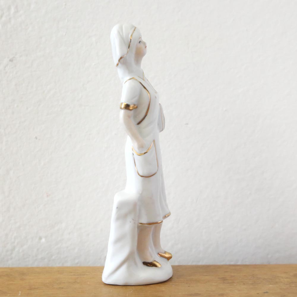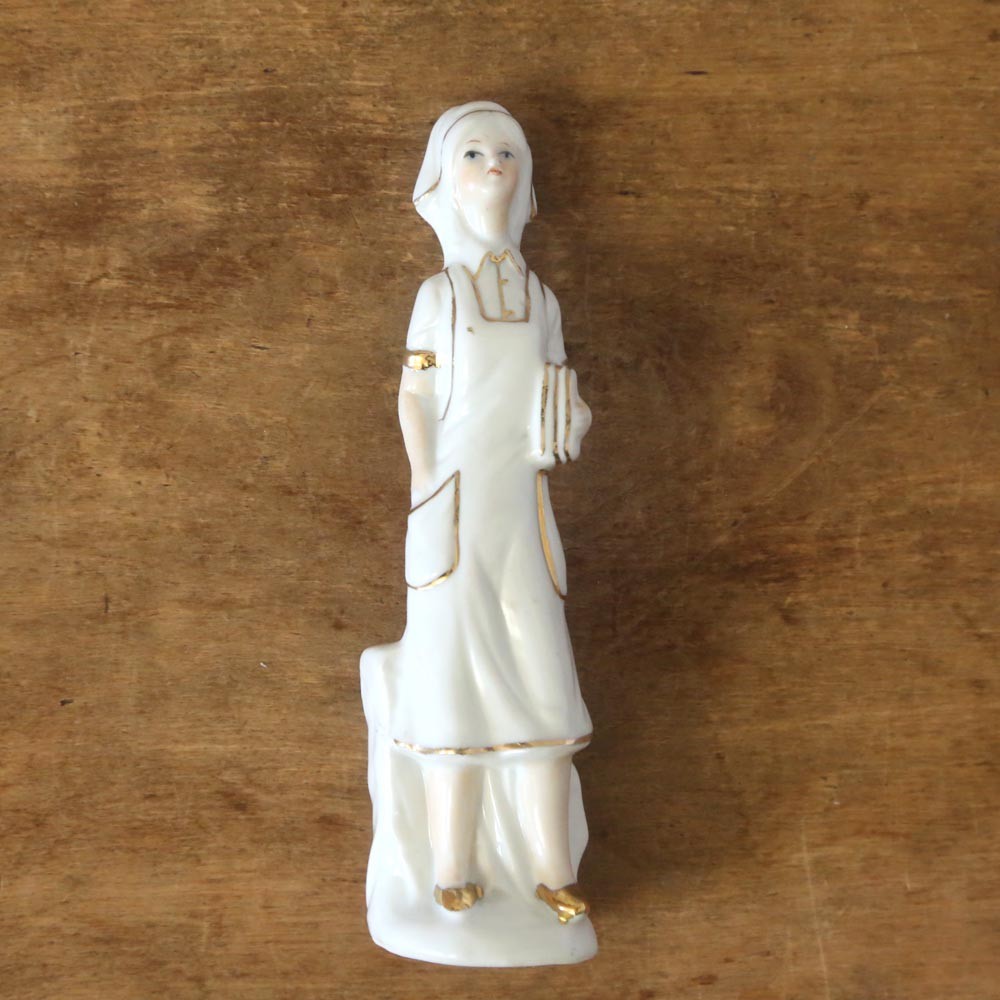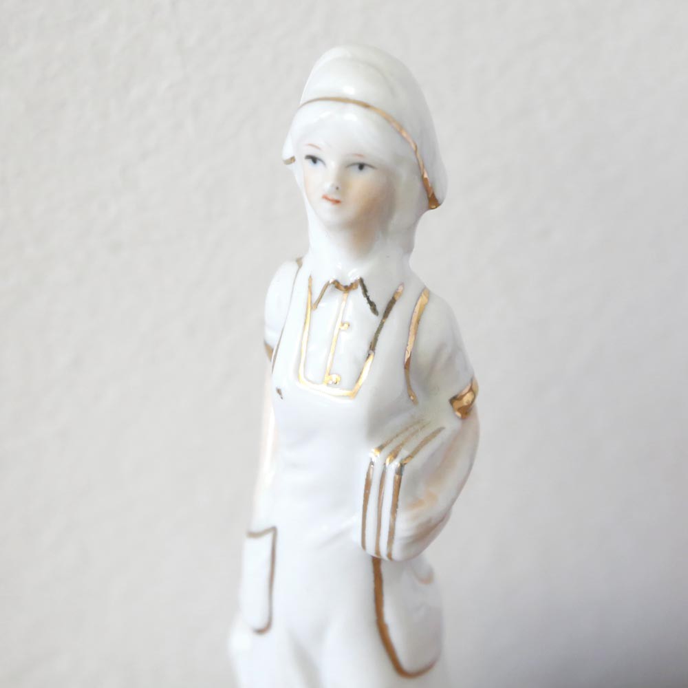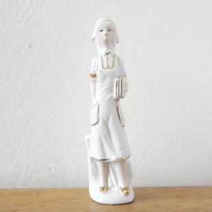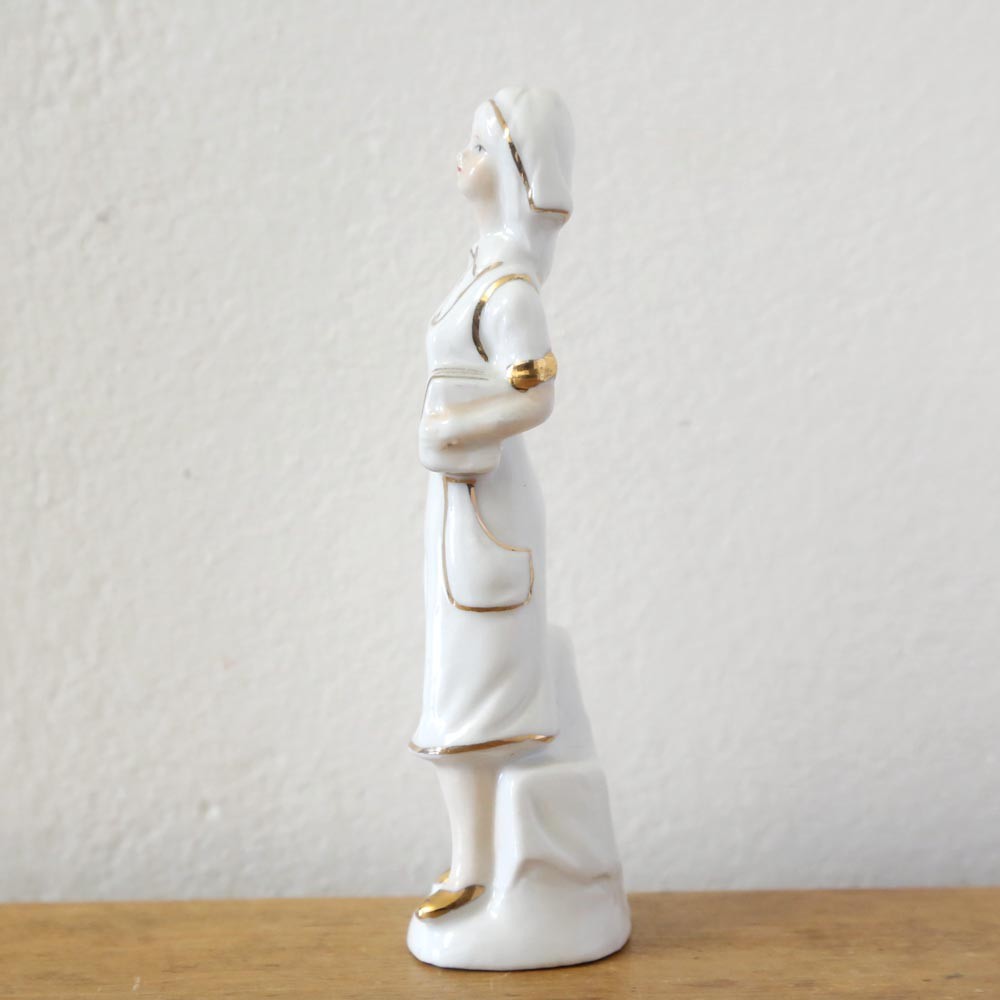 こちらは磁器製のナースの置物。チェコスロヴァキア時代1950-60年代頃のものです。白衣の天使と言いますがこちらも白いブラウス、エプロンに身を包んで、胸を張る凛とした表情が美しい立ち姿。ほんのりと色つけされた肌の色が柔らかく素敵です。金のラインは本物の金により手作業でラインを入れられています。かけなどなく状態もいいものです。