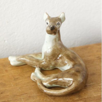 こちらはチェコの陶器のグレート・デーン。ヨーロッパの中でも特に犬の好きなチェコの人たち。国内ではたくさんの種類の犬が買われています。グレート・デーンは大型犬でもともと猟犬として飼われていたもの。穏やかで賢いグレート・デーンの表情をよく捉えた美しい陶器。うっすらと笑いを浮かべた表情も素敵です。両耳の先に1mmに満たないごく小さな顔料(表面のニス)の剥がれがありますが、目立ったカケキズなどなく状態はいいものです。シンプルながらできのいい置物で360度どこからみてもほっこりする味わいがあります。犬のお好きな方におすすめのチェコスロヴァキア時代のヴィンテージです。