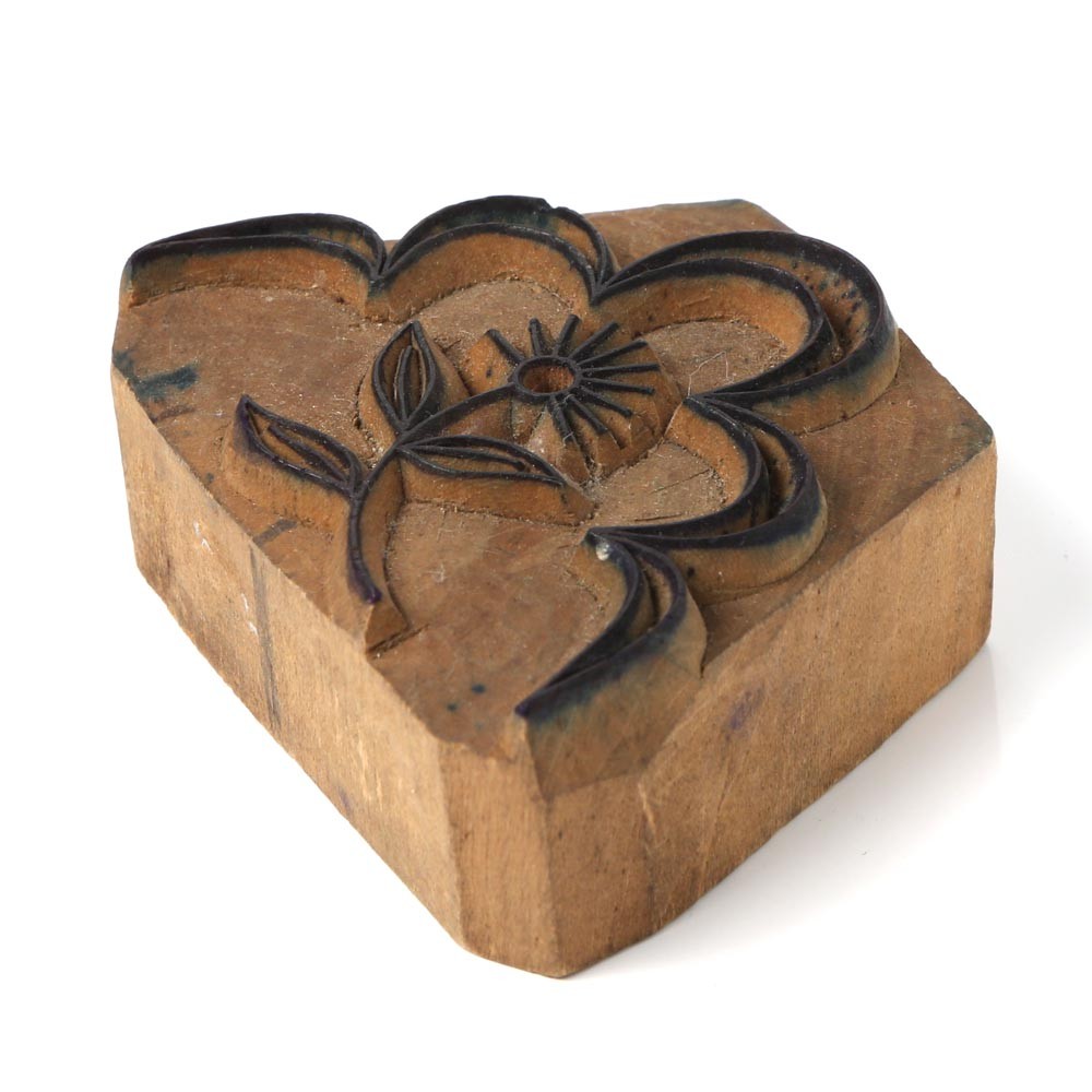 こちらはチェコの藍染に使用されていた木製スタンプ。藍の色がのらないように、海糊を布に移すためのスタンプです。長年使われていた経年の美しさがあります。藍の色も木や金属の部分に染み込んでいて、アンティークの風合い。こちらは手彫りで施された波型とお花モチーフの可愛らしいスタンプです。インテリア小物としても使用できますし、粘土細工、ハンドメイドの道具としても、アイディア次第で使い方は色々とです。古いものの質感がお好きな方に。