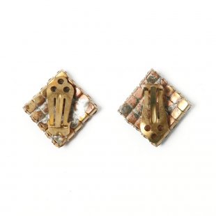 こちらはチェコのクリップタイプのイヤリングです。80年代のスタイルを持つポップなイヤリングで正方形、表面はそれぞれ25個のカットガラスがはめ込まれています。両方でブルーとレッド、カラーが異なり遊び心の感じられる楽しい一品です。金属部分に焼けが見られますが概ね製造時からものと思います。金属アレルギーのある方にはお薦めいたしません。ネオンのような発色のいいお色で実際に装着されると大きめで存在感があります。ガラスらしいキラキラ感も素敵です。
