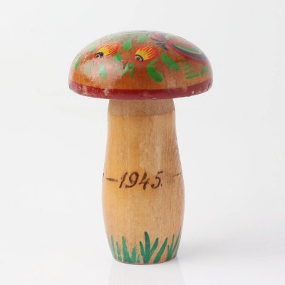 こちらは1945年に作られた木製のきのこの入れ物。すべて手製、手作業でペイントされ、ペン先で焼きを入れる形で、1945年の思い出と文字が入っています。傘の部分が外せ、下の部分は空洞になっていて、何かを収納できる形になっています。大切な手紙やメモ、小物を入れておくものです。1945年第2時世界大戦の終わった年、どんな思い出がこの中に入っていたのか。いろいろと想像が掻き立てられます。傘の部分には、中東欧らしいオーナメントのペイント、全体はニスがうっすらと塗布されていて、置物としてもとても雰囲気のあるものです。きのこ好きの方におすすめの一品です。