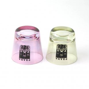 こちらは小さなショットグラスの2個セット。表面にプラハの街の紋章が印刷されたショットグラスでお色は黄緑色と淡い紫色。表面には薄い金属加工が施されていて、うっすらと虹色のニュアンスがあります。小さいながら華やかでちょっとレトロ、可愛らしいグラスです。飾り棚のインテリアにもオススメです。もちろん普段使いにも。