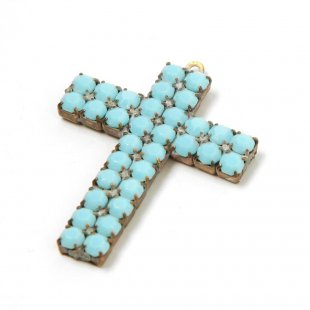こちらはラインストーンのクロスのペンダントヘッド。不透明な水色のガラス石が32個連なって十字架の形になっています。台座とガラスとガラスの間をつなぐ溶接部分に白浮きのようなものがあるためお求めやすい価格でご提供です。ザビでもろくなっているというようなことはございません。ブローチとして作り直したり、飾りとしてどこかに縫いつけたり、使い方はいろいろ。だいたい80年代ごろのものと思います。