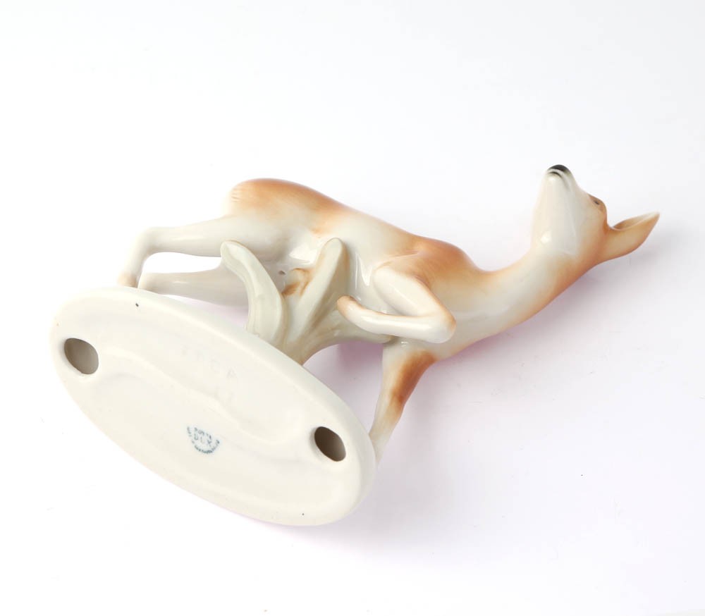 こちらは1853年からの歴史があるチェコの老舗高級陶磁器メーカー、ロイヤル・ドゥクスの発売する動物の置物のシリーズの中から磁器製の鹿の置物です。かつては高級なインテリア小物としてチェコスロヴァキアのご家庭の飾り棚などに良く見られたものです。丁寧な職人さんの手作りで、ふと脚と止める鹿の静と動が表現され、鹿の毛の色なども精巧に表現された良品です。家庭で大事にされていた物が多いため、アンティークショップでも状態のいいものが多いのが特徴です。こちらのヴィンテージの市場でも人気のある商品です。メイド・イン・チェコスロヴァキアの銘のあるヴィンテージ商品です。