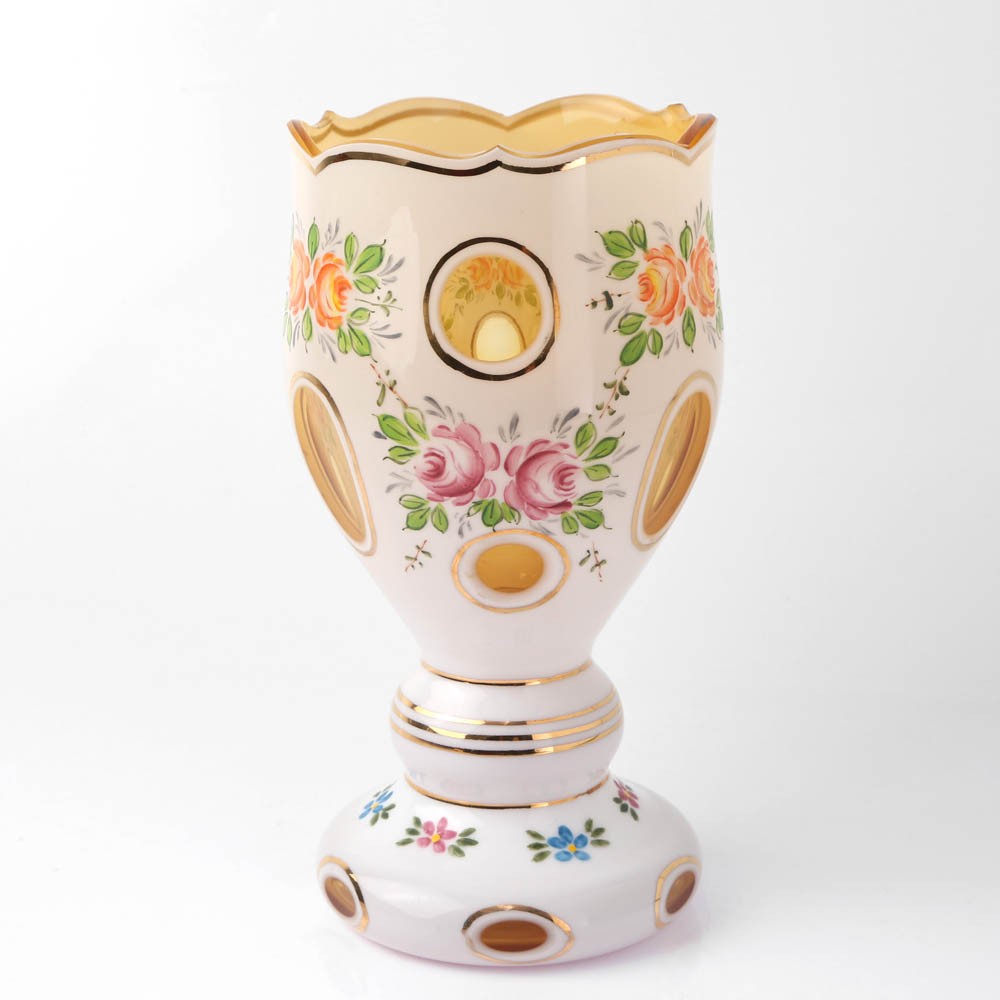 こちらはチェコに古くからあるガラス工芸品の花瓶です。土台になっているガラスは黄色みの強い淡い茶色、その表面に淡いピンク色のガラスが層として重ねられ、上からカット面を入れることで透明な部分を部分的に出現させ小窓のようになっているところがあります。ピンクの表面には手書きで赤やオレンジのバラの花が書き加えられています。金のラインの華やかさを加えています。こちらは高級品としてチェコで長く愛されているガラス器でインテリア雑貨にしたり、花瓶として使用したりするものです。手作業の美しい職人さんの仕事が楽しめ、ガーリーな雰囲気の秀品です。ガラス肌は厚く全体としてどっしり、存在感もあります。古くから長く作られているのでこのガラス器自体の年代は定かではありません。(チェコスロヴァキア時代のヴィンテージです。)かけや目立っただったスレ傷などなく状態は良好です。