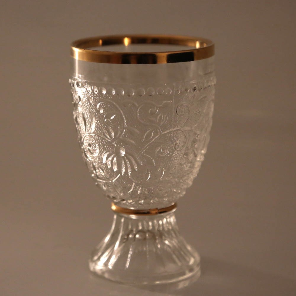 こちらはチェコスロヴァキア時代によく製造された型押しのガラスのゴブレット。ワインやビール、ソフトドリンクを飲むんだり、カフェに使用するチェコの方も。型押しで表面にはカーブを描く優雅な蔦の植物文様とお花のモチーフが施されています。飲み口を脚の部分に金のラインがアクセントで入っています。近年チェコ人のノスタルジーを誘うアイテムとして型押しガラスは人気のあるアイテム。喫茶店などでもよく使われています。特別高価なものではありませんが、雰囲気がありオーソドックスなデザインで長く楽しんでいただける一品かと思います。カップはどっしりとしていて、割と重さがあります。熱湯はお勧めできませんが、暖かいの飲み物、冷たい飲み物両方でご使用いただけます。