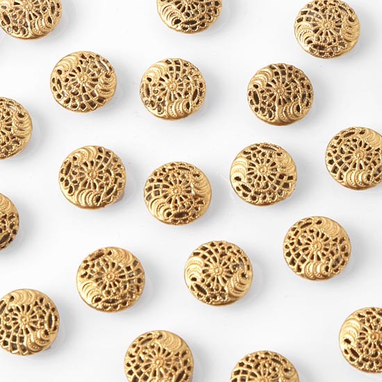 こちらはチェコスロヴァキア時代の古い金属のボタン。フィリグリー(針金細工)のスタイルの繊細な模様なとても素敵なボタンです。褪せた金色のボタンは、豪華でシックな雰囲気。シャツやベストなどに使用すると全体の雰囲気がぐんとおしゃれになります。ヴィンテージの古いボタンで、残念なことにチェコスロヴァキア時代から長く続いた生産は終了し、こちらは在庫があるだけ、入手困難な貴重な商品です。古いものですが状態は良好、目立った色焼けなどもありません。
