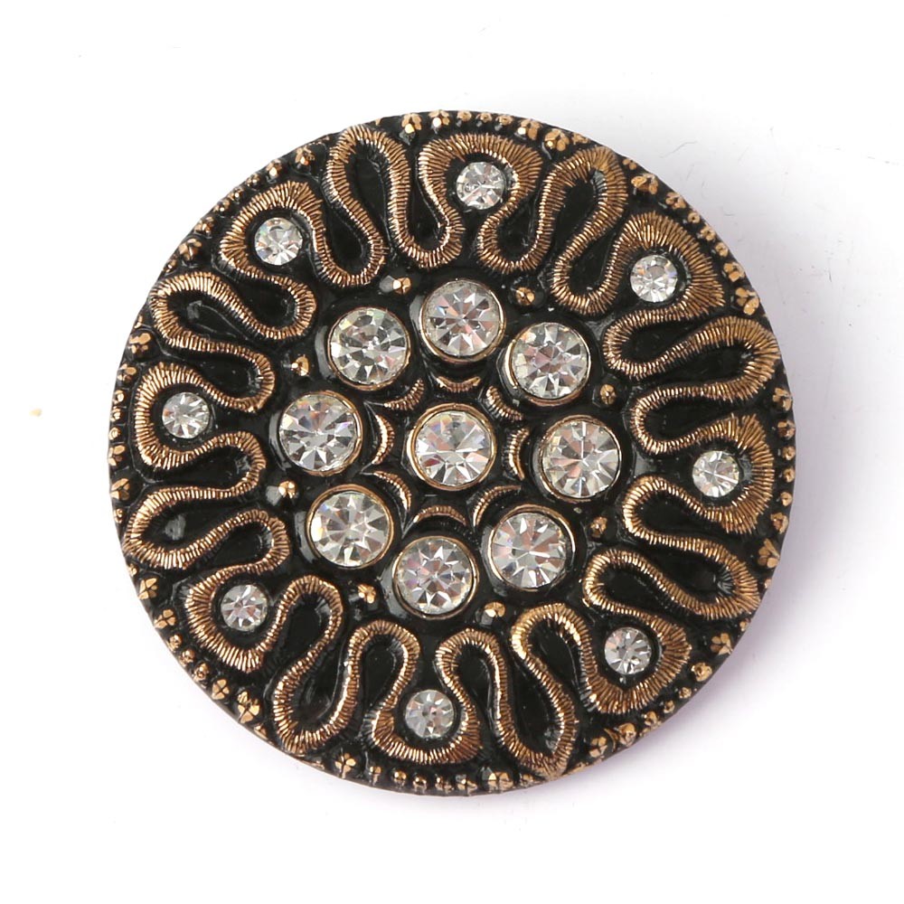 こちらはチェコスロヴァキア時代の黒ガラスのブローチ。かなり大きめ4.5cmで、クリスタルカットガラスが、大小合わせて17個も使われています。型で打ち出された模様はウェーブを描く縄模様のような抽象的なもので、コマからラインが入っていて、その上から金の塗料が塗布されています。華やかで大人っぽい印象のブローチです。黒とゴールドのカラーコンビネーションも存在感があり、個性的なブローチかと思います。ピンの状態も良好です。黒ガラスは今では作れない貴重なガラスで、太陽の光も通さない漆黒のガラス、コレクターズアイテムとしてもおすすめです。
