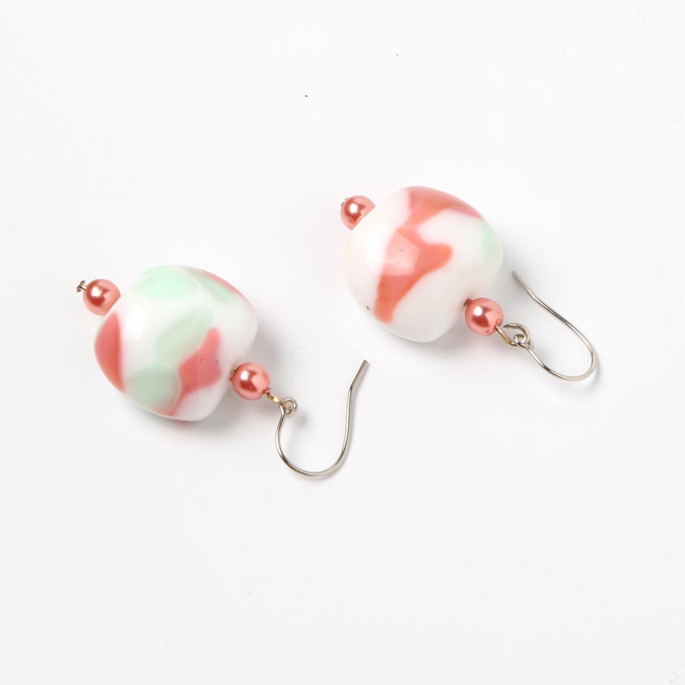 こちらは新作のチェコのピアス。ビーズ工房からのガラスパーツを使って作られています。乳白色のガラスにピンクと淡いグリーンがマーブル模様ではいっています。手作りのパーツで一つとして同じものはありません。上下にはシャンパンピンクのガラス玉が配置されていて全体的にキュートで明るい雰囲気。ガーリーでオンリーワンなピアスです。