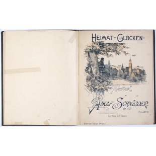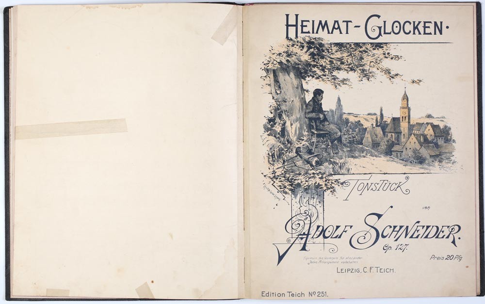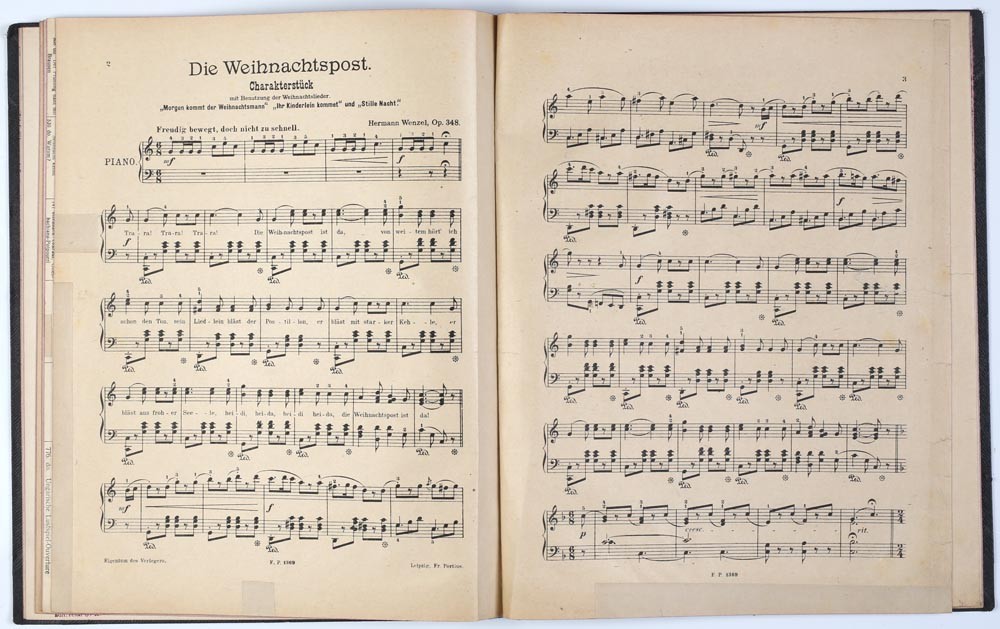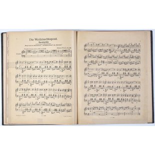 こちらはそれぞれの楽譜を一つのノートとしてハードカバーを施したものです。アルベルト・ロルツィングのオペラ曲、ワーグナーの曲やクリスマスソングなど様々な楽譜が12曲収録されています。それぞれの楽譜の表紙も年代を感じさせるものばかりで見応えがあります。楽譜のページで破れが張り直された箇所があります。サイズは26.8x 33cmと大きめのノートです。状態は当時のものとしては悪いものではありません。100年古いアンティークです。
