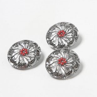 こちらはチェコのガラス工房からの手打ちのガラスボタン。直径2.7cmの大きめのボタンで、ボタン全体にカーブを描くお花が施された美しいデザインです。また裏からマットシルバーの金属塗料が塗布されているため、奥行きのある光を放つ美しいガラスボタンです。お色は落ち着いたシルバーで雄しべの部分の赤い色がアクセントとなって印象的なデザインになっています。写真では3つで写っていますが、一個売りのお値段です。