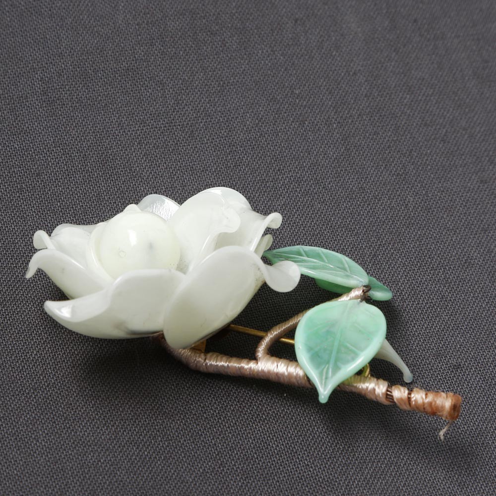 こちらはチェコ第一共和国時代(1918-1938年)の野ばらのブローチです。花びらも葉っぱも蕾もすべてガラス片でできています。ガラスの職人さんがかつて手作業で製作したもので、花びらや葉っぱは薄く繊細で、見入ってしまうような美しい仕事です。ブローチ自体も落としたりすると壊れてしまうとても繊細なもの。市場ではなかなか出ない貴重なブローチですが、市場に出ても花びらが割れていたりして、ここまで完璧な状態のものは現代ではなかなかお目にかかれません。またこちらの白薔薇は花びらにウランガラスが使われています。ブラックライトでほんのりとグリーンの光を発します。ウラン自体は自然界に存在するのと量は変わりませんので、人体に影響はありません。花びらもピンの状態も当時のままの素晴らしい状態のものです。チェコでも貴重なとっておきのコレクターズアイテムとしてご紹介です。