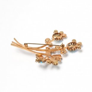 こちらは1940-50年代のチェコスロヴァキア時代のヴィンテージブローチ。金属塗料が施されメタリックの輝きのあるガラス石が使用されています。お花のモチーフの楽しいデザインのブローチで、7.5cmとボリュームもあり存在感があります。長方形のガラス石や楕円形のガラス石が使用され全体でブーケになっていて、デフォルメされたデザイン、冴えたブルーのガラス石のお色も素敵です。ピンには色移りするほどではありませんが、焼けが入っています。また、茎が一つになる部分にサビのような黒い色が見えます。長い時代を経たチェコスロヴァキアのヴィンテージです。