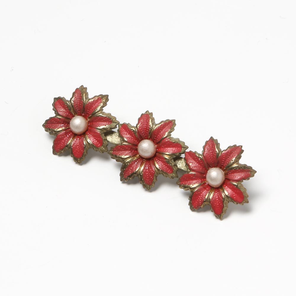 こちらはデッドストックの古いブローチ。戦前1930年代前後のとても古いチェコのブローチで、工場の古い在庫から未使用品で入手しました。金属製でお花が3つ連なったシンプルでキュートなブローチです。懐かしい感じの紅色の彩色で、3つのイミテーションパールもあしらわれています。ノスタルジックで昔懐かしい雰囲気のブローチです。経年の風合いがありますが、ピンの状態も含め状態は良好です。「ほとんどアンティーク」古い貴重なヴィンテージです。