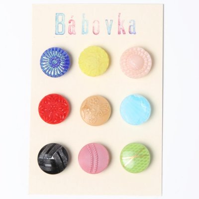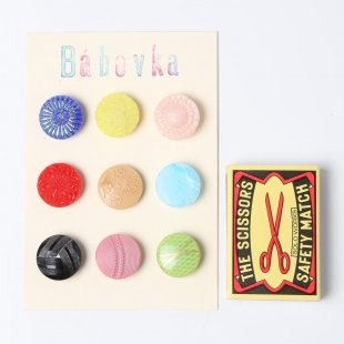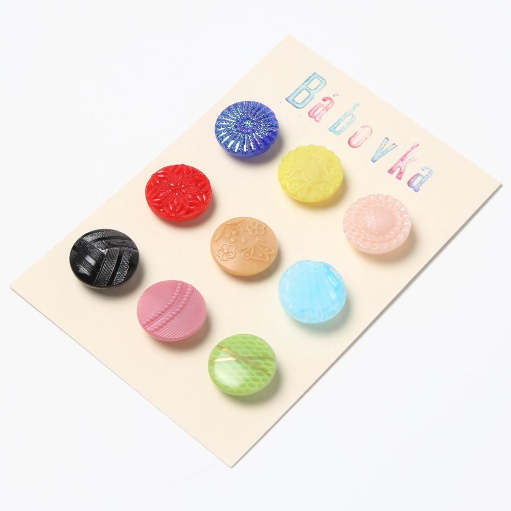 こちらはヴィンテージのガラスボタンをバーボフカのカードに縫い付けたものです。9個のガラスボタンでお色もデザインもさまざまな不透明のガラスボタンをセットにしました。古いものですので色のむら、形の歪なボタンもあります。直径は1.8cmのボタンです。お色もデザインもユニークで個性的なボタンばかりです。コレクションにもオススメです。