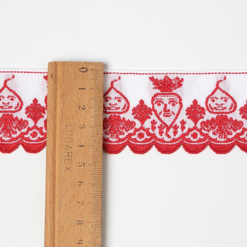 こちらはお裁縫店で長く保管されていたデッドストックのヴィンテージ・リボン。こちらは人参やかぶのような野菜のお顔が刺繍されたとても楽しいデザインのテープです。赤と白で爽やかな雰囲気もあります。裾は波型のステッチが入りなかなかフェミニンな仕上がり。何より、くすっと笑ってしまうような愉快なデザインが、とてもチェコらしい一品です。今では入手できないなかなか貴重なリボンです。お裁縫のお供にいかがでしょうか。