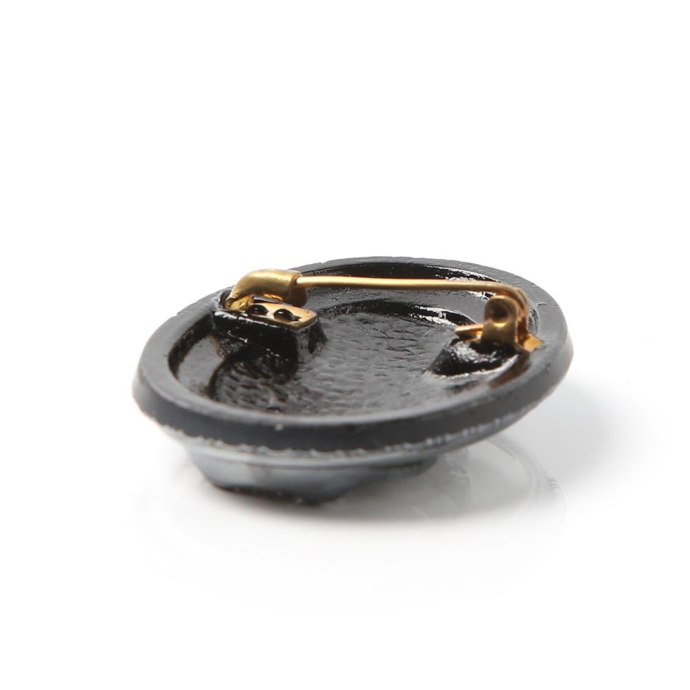 こちらはヴィンテージのジェットガラス製ブローチ。表面には銀の塗料が塗布されたカメオのブローチです。オーソドックスな楕円形のフレームで表面には鏡面のような輝きがあり、ちょうど鏡に映った横顔を見ているかのようにみえます。こちらは1930-40年までの古いブローチですが、デッドストックでとても状態のよいものです。色焼けなどもなく新品のようです。漆黒の黒と呼ばれるジェットガラスを使用したチェコでも貴重なアイテムです。静謐とした美しさを持つチェコからの秀品です。