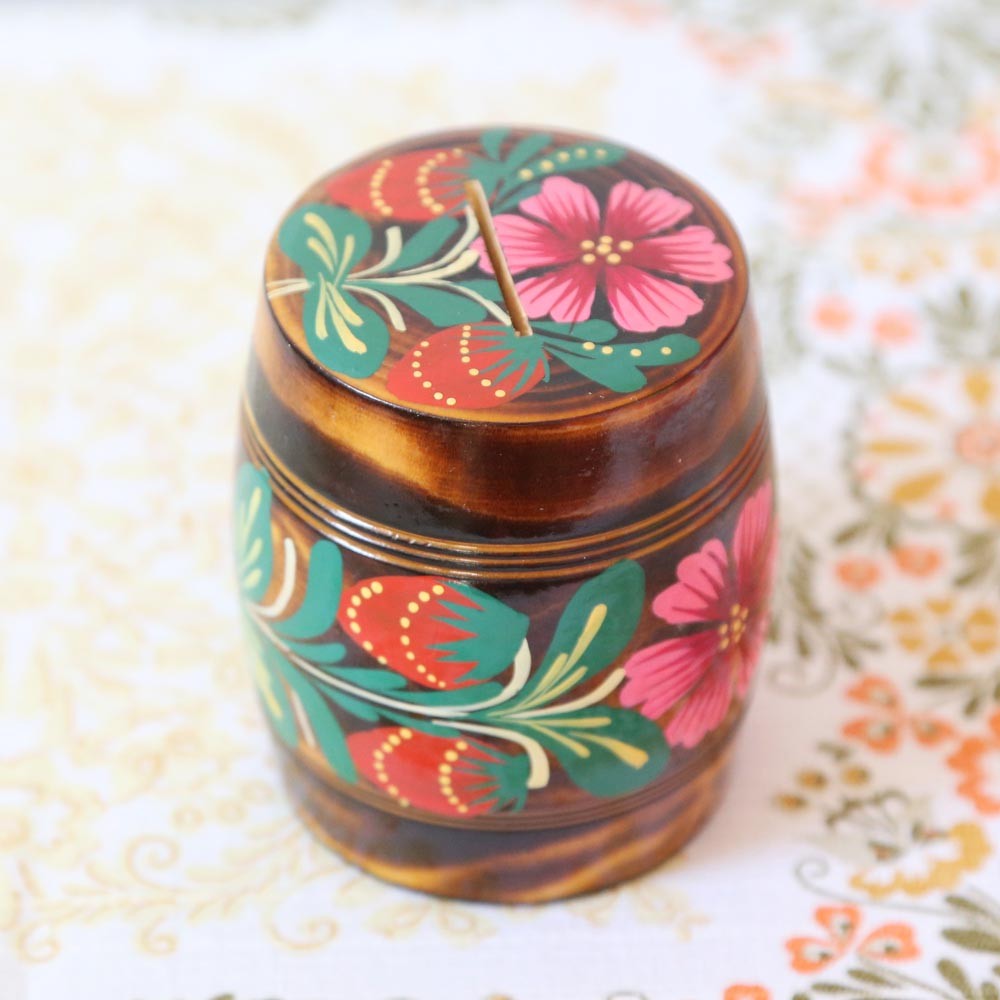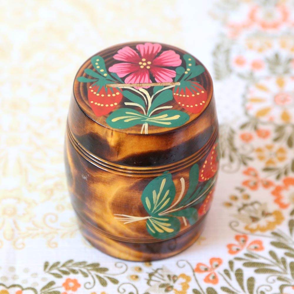 こちらはロシア製の木製の貯金箱。樽の形をした貯金箱で、中は空洞、上部表面にコインを挿入する穴があります。表面には手作業でイチゴとピンクのお花が大胆なタッチでペイントされています。チェコでは共産主義時代にチェコにもたらされたこのようなロシアの工芸品をたまに見ることがあります。こちらもチェコのご家庭のインテリア棚を長い間飾っていた一品です。状態も良好です。実際に貯金箱として使用するのもよし、インテリア雑貨として飾りに使用するのもよしです。お金を取り出す時には壊さなくてはいけないので、ご留意ください。ぱっと華やかな存在感のあるロシアの手工芸品です。