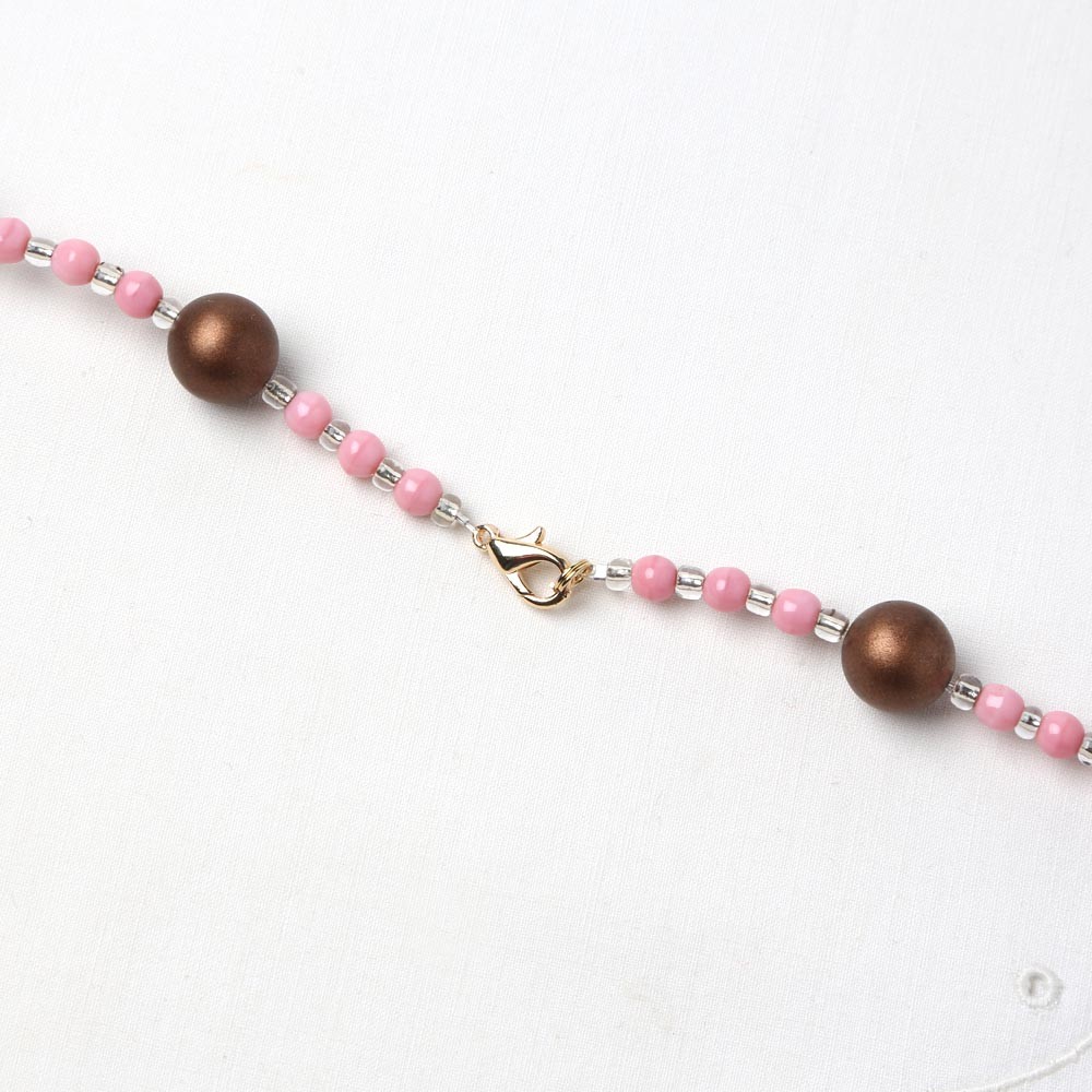 こちらは北チェコのアンティーク・バザールで入手したデッドストックのガラスビーズのネックレス。1950-60年代の古いものです。いちごチョコを思わせる様な茶色の大きめのビーズとピンク&クリアのガラスビーズで構成されたキュートな雰囲気のネックレスです。かなり古いもので糸に傷みがありましたため、糸とパーツは新しいものに変えられていますので、糸切れなどの心配がありません。茶色のビーズは北チェコでよく見られるシャンパンカラーの塗料が塗布されていて、軽めで空洞の入ったガラスビーズかプラスチックかわかりません。ビースの表面に少し擦れが見られるものがあります。遊び心の感じられる明るいレトロな印象が素敵な一品です。