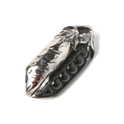 こちらは大変珍しいアンティークのガラスボタン。今では使用できないジェットガラスを使用したガラスボタンでさやえんどうのデザイン。葉とさやの部分には金彩が施されています。細かく砕いたガラスの粉で作ったガラスでねりあめのような独特の質感があります。またギュッと詰まったような漆黒の黒が美しいボタンです。年代は1900年代初頭のアンティークです。ずばり貴重なコレクターズ・アイテム、オーストリア・ハンガリー帝国時代の秀品です。