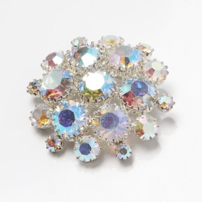 こちらはチェコスロヴァキア時代1960年代のカットガラスのブローチ。大小のガラス石が丸の形に配置されていて全体の直径が4.5cmもある大振りのブローチ。ガラス石にはAB塗料が塗布されているため、冴えた虹色の輝きがあります。表面と内部からの光が交差して、様々なお色が混じり合う美しいガラス・ブローチです。帯留めなどにしてもとても素敵です。このタイプのガラス石は表面塗料に経年の擦れなどが見られますが、こちらのブローチは保存状態がよく、擦れや金属焼けがほとんど見られません。ピンの状態など含めてとても状態の良いものです。