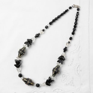 こちらはチェコスロヴァキア時代1920-30年代のアールデコのヴィンテージ・ネックレスです。職人さんが手作業で研磨したガラス石は、多面ビーズの他ひし形やお花の形で、それぞれに意匠が感じられます。また炎の中で行われるファイヤーポリッシュという古い研磨方法が使われた、貴重なクリスタルビーズを使用しています。中央と左右に配置されるビーズは珍しいガラライト製です。ガラライトはミルクプラスチックとも言われ、牛乳のタンパク質から作られるプラスチックの一種で、ヨーロッパとアメリカを中心にコレクターに人気があります。ココ・シャネルも初期のコレクションにガラライトのアクセサリーを使っていたことも知られています。アールデコならではの彫りとデザイン製の高いビーズです。モノトーンでキリッと大人っぽく仕上げられたアール・デコのネックレス、美術館に展示されていても全くおかしくないほどの貴重なお品です。目立ったかけなどなく状態もとても良いものです。90年から100年近く古いお品、ズバリとっておきです。