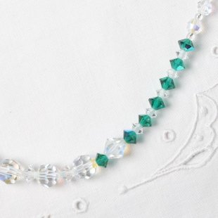 こちらはチェコスロヴァキア時代のヴィーンテージ・ネックレス。透明のクリスタルとグリーンのガラスビーズを使用したクラシックなネックレスです。年代は定かではありませんが、こちらは比較的新しい時代のものです。カット面が均一で鋭く、強い輝きを持つクリスタルビーズで構成されていて、高級感があります。涼やかでオールシーズン使用していただける優れものでもあります。パーツ自体は古いものですが、ビーズを連ねる糸はナイロンの糸ですので、糸切れ防止などのために後でレストアされたものかと思います。糸に少々緊張(ビーズの詰まり)がありますが、身につけていただくと気になりません。チェコらしいガラスのネックレス、色々なシーンで使っていただける良品です。
