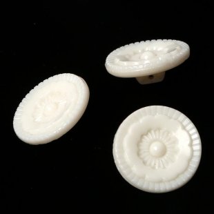 こちらはアンティークのガラスボタン。乳白色のガラスを使用したボタンで、表面にはお花のモチーフが施されています。全体的に柔らかくフェミニンな感じの美しいガラスボタンです。100年古いボタンです。カードに破損がありましたので、外して一つ売りですが、カードに縫い付けてあったため、状態もとても良いものです。製造時、ガラスを流し込む時に入って入るレイヤー(層)の線が見えるボタンがありますが、ひびではございません。コレクターズアイテムとしてお勧めいたします。