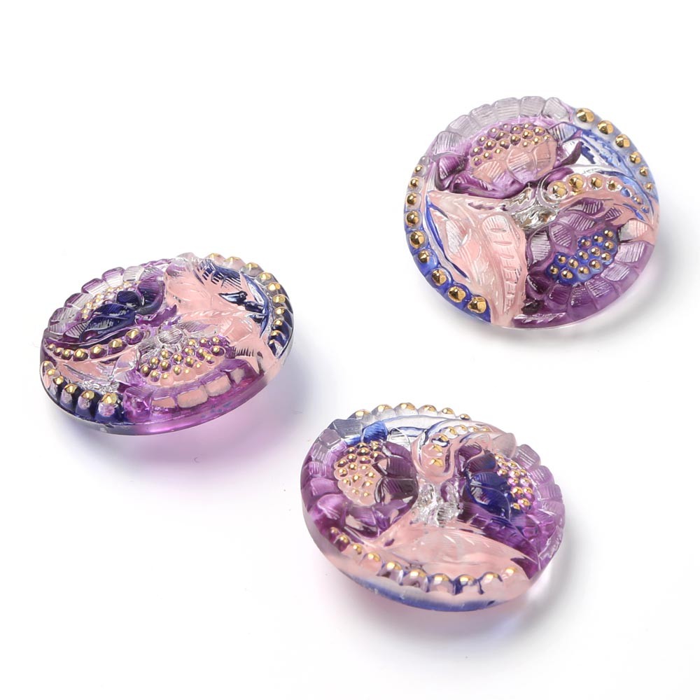 こちらは北チェコで長い間製造されてきたガラスボタンです。こちらのボタンは大きな向日葵のようなお花が2輪、ボタンの表面に所狭しと大きくデザインされています。裏からピンクとパープルの彩色が施され、また表からは金彩で奥行きのある作りになっています。こちらのボタンはガラス本来の質感の楽しめる涼やかな印象のボタンで、華やかさもあります。留め具や帯留め、アクセサリーなどにもおすすめです。