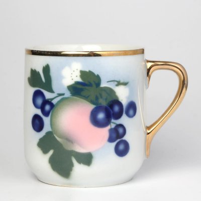 こちらはチェコスロヴァキア時代20世紀初頭アンティークの磁器製マグカップ。そこには工場のオーナーであったH・レインヌルの銘が入っています。(大きな老舗ではありませんが、古い磁器製品にはたまに見られる銘です。)大きめのマグカップで表面には吹き付けでぶどうとりんごのモチーフが施されています。ブルーチェリーの柄に代表されるようなこの吹き付けの製法も、1900年代初頭から1930年代あたりまでによく見られる製法です。ぼやっとした柔らかな色ののりがキュートで美しい仕上がり。飲み口と把手には金彩が施されています。金彩のはげもほとんどなく、状態もとても良いものです。カップの内部に数点黒い汚れがあります。製造過程に入ってしまうもので、ご使用には支障ございません。長い年月を経たとっておき・・・こちらでもアンティークのマグは人気のある商品です。