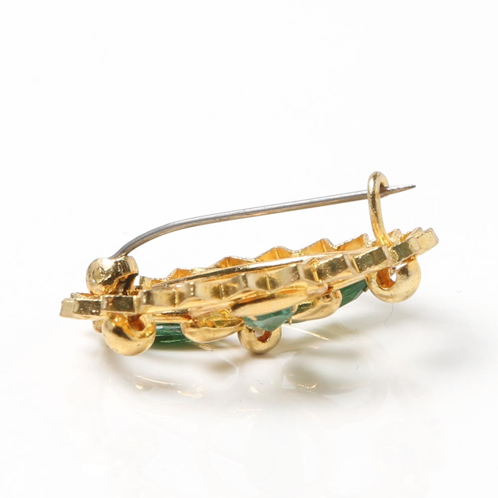 こちらはチェコスロヴァキア時代1920-1930年代のヴィンテージ・ブローチ。戦前のとても古いヴィンテージです。クローバーが金の円環に収まり、葉っぱの部分に雫型の 発色のいいグリーンのカットガラスがあしらわれています。繊細で可憐なデザインです。時代の古いアクセサリー独特の、昔懐かしい雰囲気もあります。こちらは北チェコの工場のデッドストックをそのまま仕入れた商品で、状態もとてもいいものです。ピンには若干の色焼けがありますが、布に色移りするほどではありません。工場の倉庫で80年以上も眠っていた貴重なブローチです。ピンは長めですので、指など刺さないように取り扱いにはご注意ください。